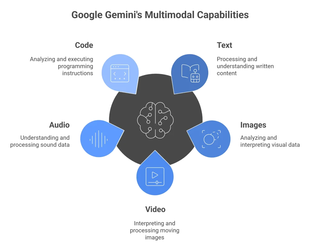 Gemini can interpret and connect data across text, images, video, audio, and code. For example, it can summarize a training video, analyze a graph in a report, or provide code suggestions, enabling holistic insights across formats.